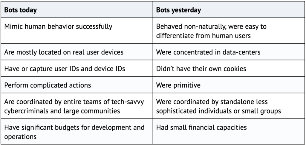 Today, bots behave differently — they are not concentrated in data centers, but they “live” in user devices. They can steal cookies and mess up with them, learn how people usually behave online, and successfully do the same.