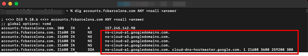 Upon scrupulous analysis, a mismatch of NS records in the second- and third-level domains has been spotted. The official website (root domain) is hosted on AWS (Amazon Web Services), yet the NS records of the subdomain are on Google Cloud DNS.