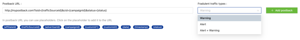 If you want to be aware of all suspicious actions that happen inside of your system and therefore – prevent all possible fraud risks, you should consider setting Postbacks feature up. Due to this simple instrument, you can specify fraud-detecting parameters and get alerts about unreliable traffic sources (from entire regions to specific web platforms).