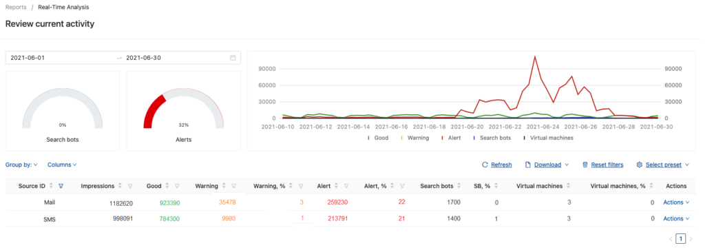 Based on our findings the client had paid for 213,090 bot clicks for the Mailing campaign, and 199,640 clicks with the SMS campaign, in June. This explained his cause of concern.