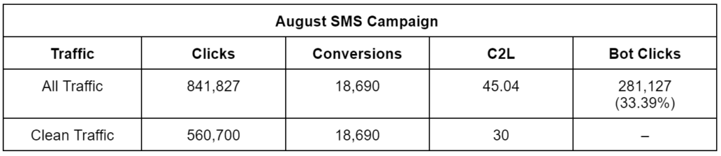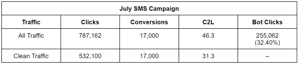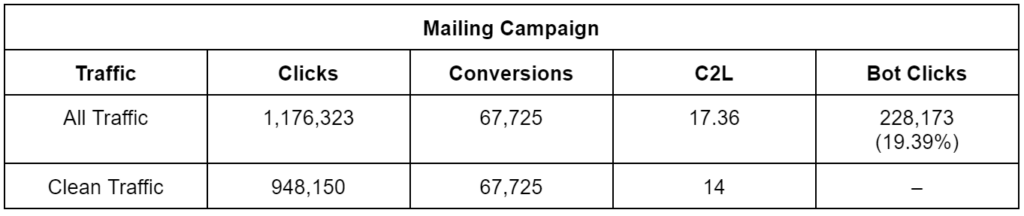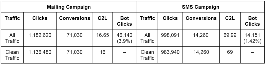 As you can see from the numbers above, our client’s built-in fraud tracking software was picking up roughly 3.90% bot traffic for the mailing campaign, and 1.42% for the SMS campaign. Clearly, that was not much of a cause for concern, but it also was something you would want to ignore.